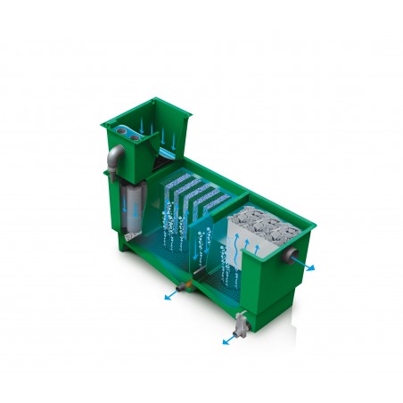 Filtration à 4 chambres Média de filtration : Brosses : filtration mécanique +++ Tapis Japonais : filtration mécanique et biologique 400 m2/m3 Flocor : filtration biologique 200 à 400 m2/m3 Flocor + Mousse Fonctionne en pompage. Choisissez l'option avec Sieve pour ajouter le préfiltre mécanique .Il piège les déchets jusqu'à 0.3 mm...