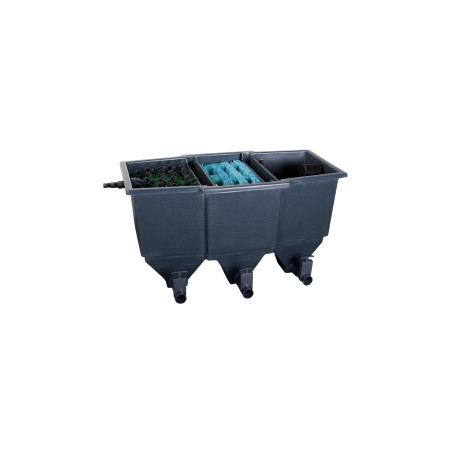 Filtration à 3 chambres  Média de filtration  156 Litres : Brosses ou Matala noir : filtration mécanique +++ 182 Litres : Matala vert/bleu ou  Biocérapond 1500 à 3000 m2/m3 182 Litres : Biocérapond Fonctionne en pompage ou gravitaire  Matériels conseillés 2X UV 110 watt ou 2X AS UV SYNERGY 15 2X Pompe à eau 11 m3/h Pompe à air pour le...