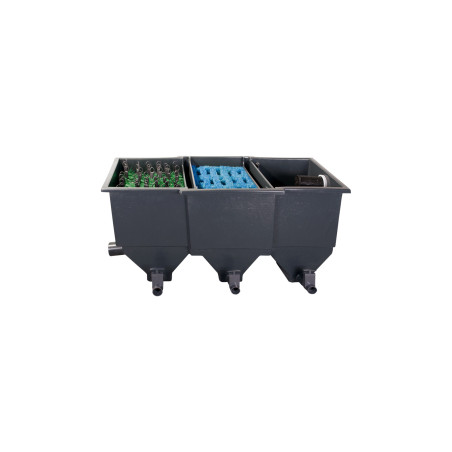 Filtration à 3 chambres Média de filtration 300 Litres : Brosses ou Matala noir : filtration mécanique +++ 360 Litres : Matala vert/bleu ou Biocérapond 1500 à 3000 m2/m3 360 Litres : Biocérapond Fonctionne en pompage ou gravitaire Matériels conseillés 2X UV 110 watt ou 2X AS UV SYNERGY 15 2X Pompe à eau 15 m3/h Pompe à air pour le...