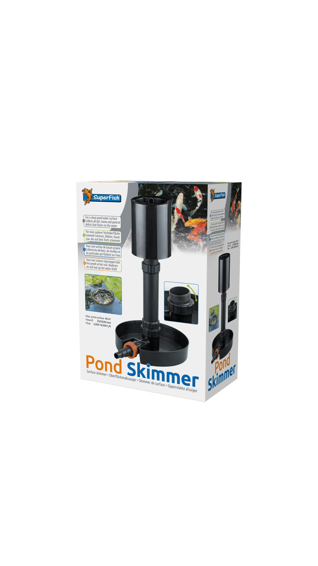 Le Skimmeur de bassin SuperFish flotte dans le bassin et aspire les saletés telles que les feuilles, la poussière et les algues à la surface de l'eau. Pour un bassin clair et sain.