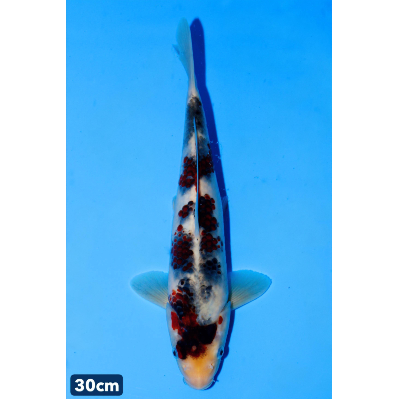 Motif Tancho parfait : rond bien défini, positionné au centre du crâne. Blanc neige : sans taches ni jaunissement, idéal pour mettre en valeur le hi. Qualité Hoshikin : lignée réputée pour la stabilité des couleurs et la croissance harmonieuse. Âge : Nisai (2 ans). Koi au magasin, Livraison disponible. Petit shimi présent a droite de la dorsale...