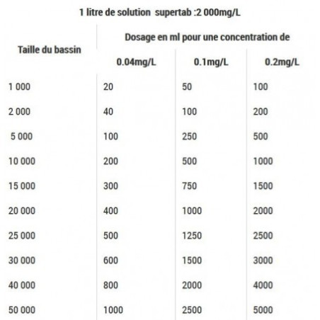 D’abord, pour un dosage d’entretien, il est conseillé d’utiliser une concentration de 0,04 mg/L. Ce qui correspond ainsi à 1 comprimé 20 g SUPERTAB pour 50 000 litres d’eau.