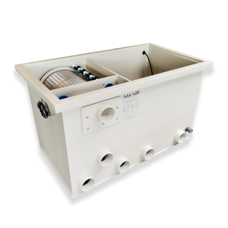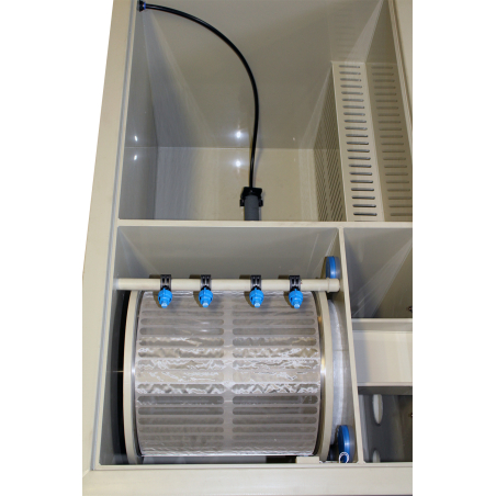 Le filtre à tambour, disposé par gravité, s'élève à environ 12,5 cm au-dessus du niveau de l'eau.