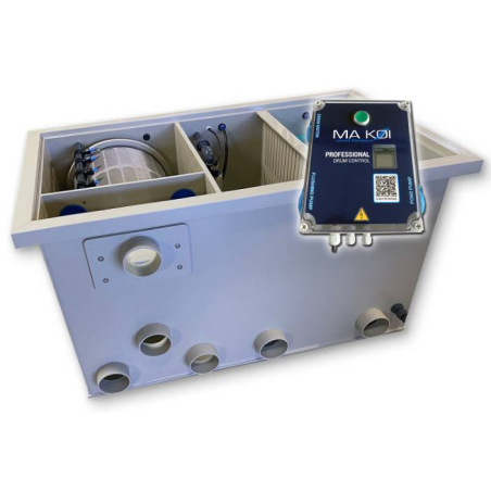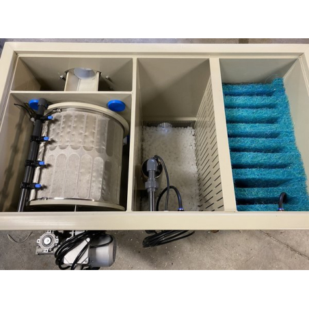 Le filtre à tambour en configuration gravitaire se trouve à environ 12,5 cm au-dessus du niveau de l'eau.