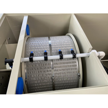 Le Biodrum 100 Pro XL est plus long de plus de 60 cm et possède deux compartiments biologiques pour une capacité de filtration encore plus importante. Le premier compartiment a une capacité de 400 litres, tandis que le second peut accueillir 5 m² de tapis filtrants japonais. L'ajout de Helix+ dans le premier compartiment permet d'optimiser les performances biologiques. Le tambour mesure 650 mm de diamètre et 400 mm de largeur, et est équipé d'un tamis de 120 microns, idéal pour un débit d'eau de 55 à 60 m³/h en alimentation par gravité.