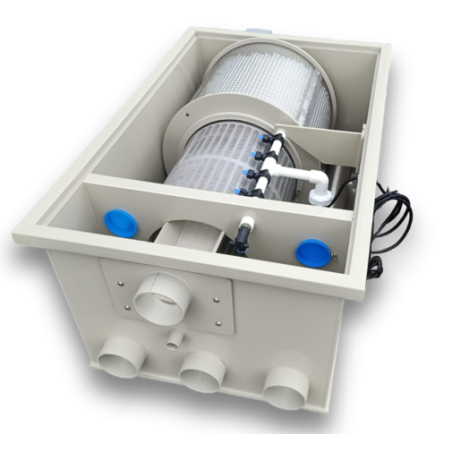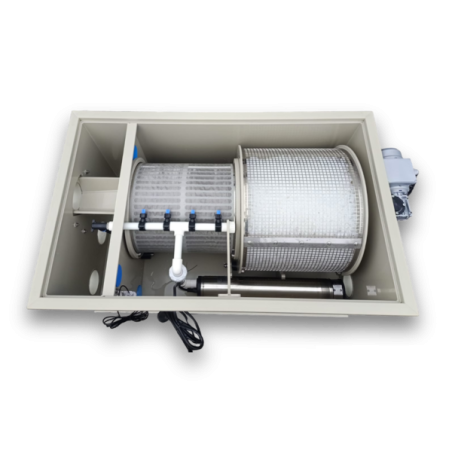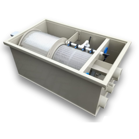 Ce Biodrum Rotator 30 est équipé d'un filtre à tambour avec une toile filtrante de 120 microns et d'un contacteur biologique rotatif (RBC). Il contient 70 litres de Hel-x 13 comme biologiste (995 m²/m³).