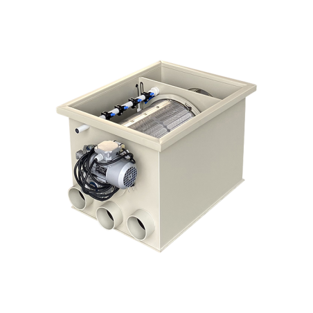 L'eau coule dans le tambour et les particules de saleté supérieures à 120 microns (0,12 mm) sont éliminées via la goulotte d'évacuation.