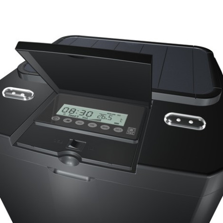 Contenu : distributeur de nourriture prêt à l'emploi avec panneau solaire, bloc électrique et sonde de température de l'eau. 2 leds rouges signalent l'épuisement de la nourriture dans le réservoir. Dimensions : 375x 375x462 mm.