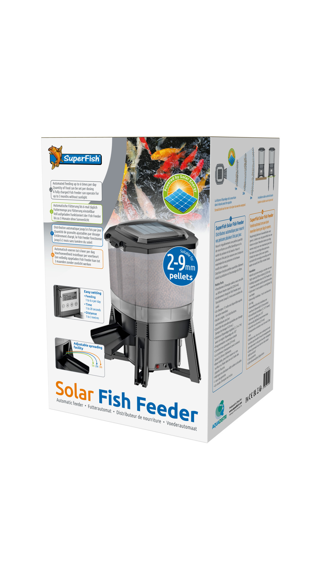 Avec le Koi Pro Fish Feeder, vous pouvez nourrir automatiquement vos poissons. Le nourrisseur est facilement réglable pour 1 à 24 distributions par jour et convient pour des granulés de 2 à 9 mm.