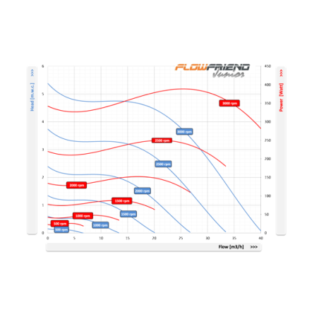 Le système hydraulique de la Junior, comme celui des autre pompes FlowFriend, est fabriqué en inox 316 et de type de débit mixé. Ces caractéristiques permettent d'atteindre une hauteur de refoulement de 5.5 mètres et un débit réglable de 40 m3/h, si bien que la pompe peut être utilisée d'une manière très efficiente. La pompe est entièrement réglable (500-3000 tpm) grâce à une commande externe.
