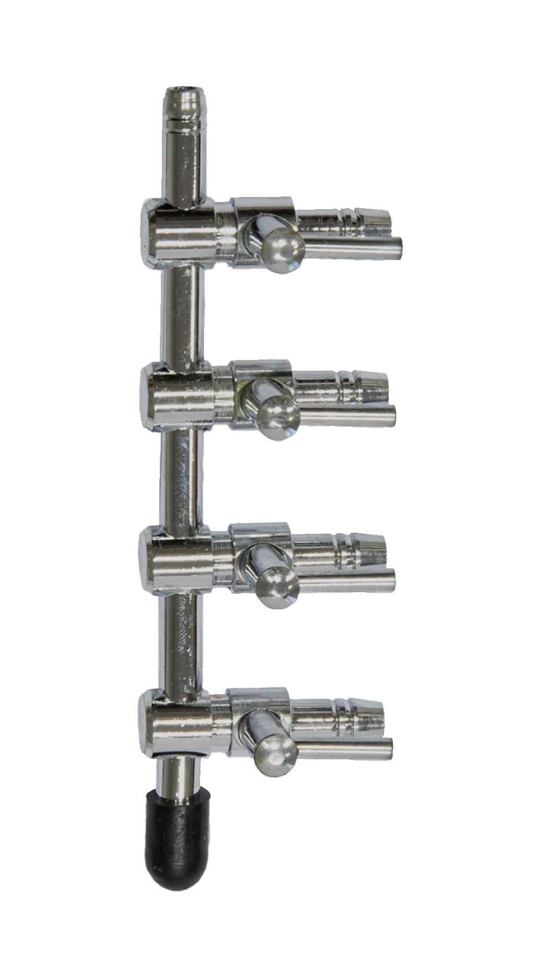 Répartiteur en acier inoxydable avec robinets pour distribuer l'air sur plusieurs sorties.