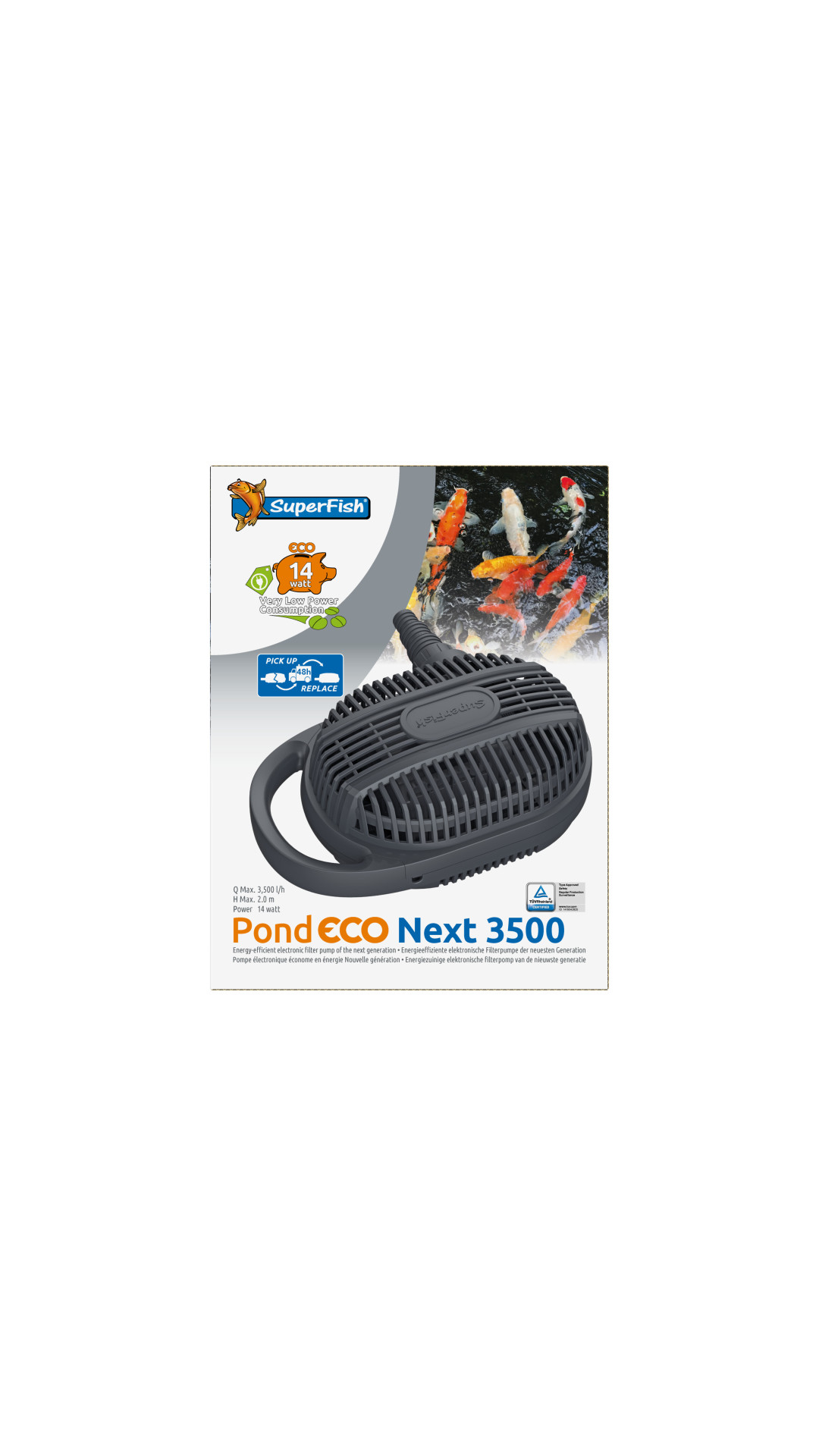 Une capacité de pompage maximale pour une consommation d'énergie extrêmement faible (4 watts pour 1.000 l/h), la pompe de bassin qui mérite un label vert ! Les lames vortex transportent des particules de saleté jusqu'à 6 mm, raccord de tuyau de plusieurs diamètres, double engrenage en céramique, protection thermique contre la surcharge et le fonctionnement à sec, utilisable en fonctionnement à sec et immergé.Avec le contrôleur optionnel Pond Eco Next, vous contrôlez le débit de la pompe sur 1 niveaux à l'aide d'une télécommande. Vous pouvez ainsi ajuster le débit d'eau à votre convenance et économiser de l'énergie en régulant le débit de la pompe pendant les mois d'hiver, par exemple. Vous pouvez acheter le contrôleur Pond Eco Next auprès de votre revendeur Superfish.Capacité de la pompe 35 L/h, consommation 14W, hauteur de remontée max. 2m, sortie 25/32/4mm, câble de 1 mètres, approbation TUV et fourni avec une garantie unique Pick-up & Replace de 2 ans !